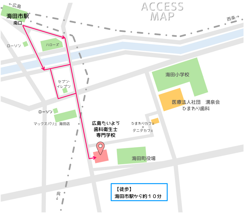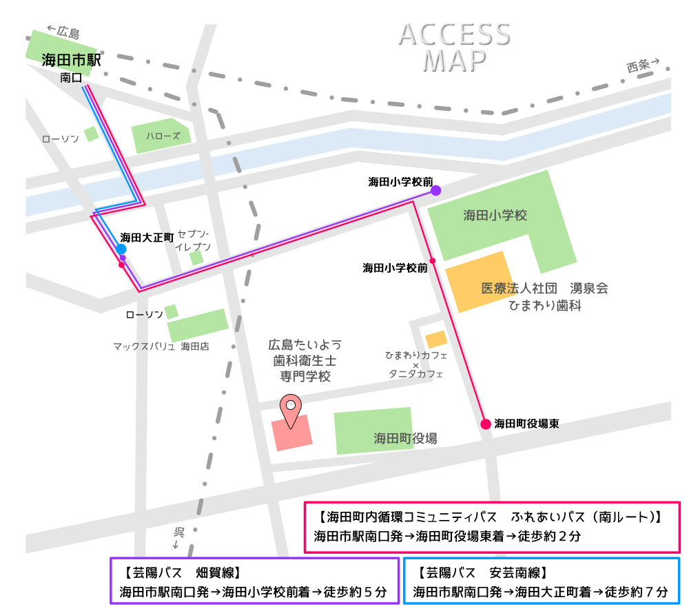 - JR「海田市駅」から、芸陽バス「安芸南線」に乗車。「海田大正町」バス停で下車後、徒歩約7分で本校に着きます。