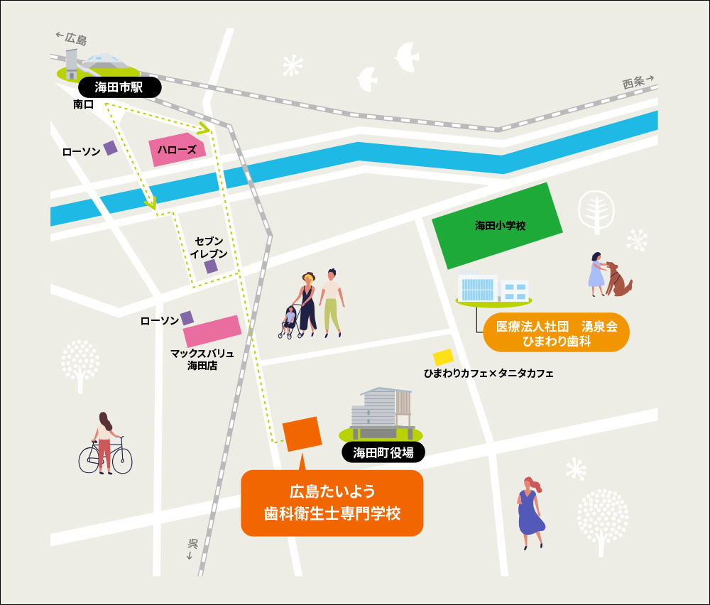 本校がある広島県安芸郡は、都市部へのアクセスも良く、落ち着いた環境の中で学びに集中できる立地です。最寄りのJR海田市駅からは広島市内へのアクセスもスムーズで、通学にも便利。放課後に立ち寄れるカフェやスーパーも充実しています。少し足をのばせば、安芸の宮島や広島城、地元の神社など、歴史と文化を感じられるスポットも。学びも暮らしも楽しめるのは、広島だからこそ。ここでしか味わえない豊かさを感じてください。