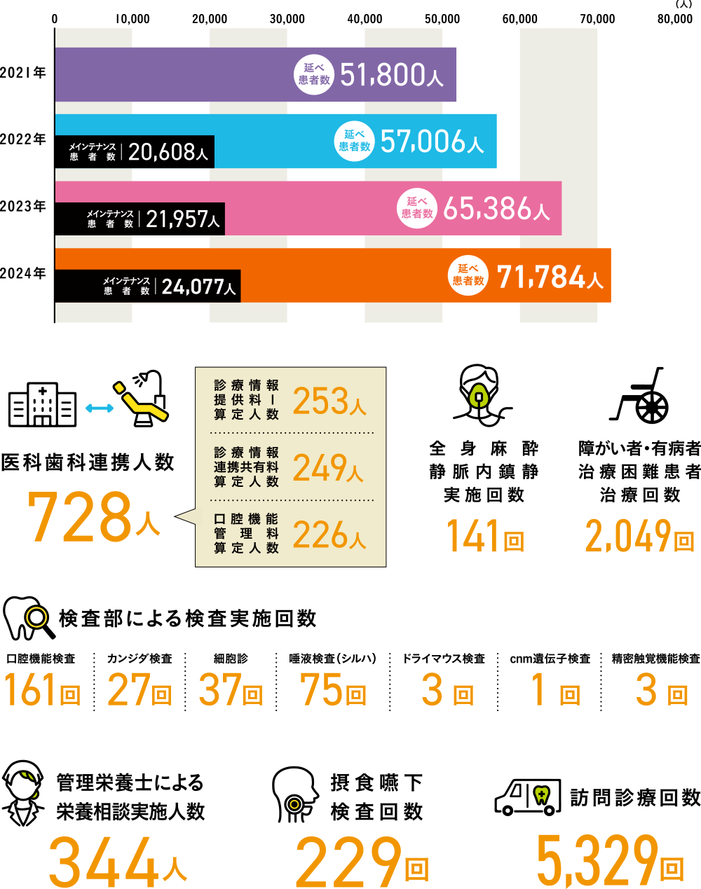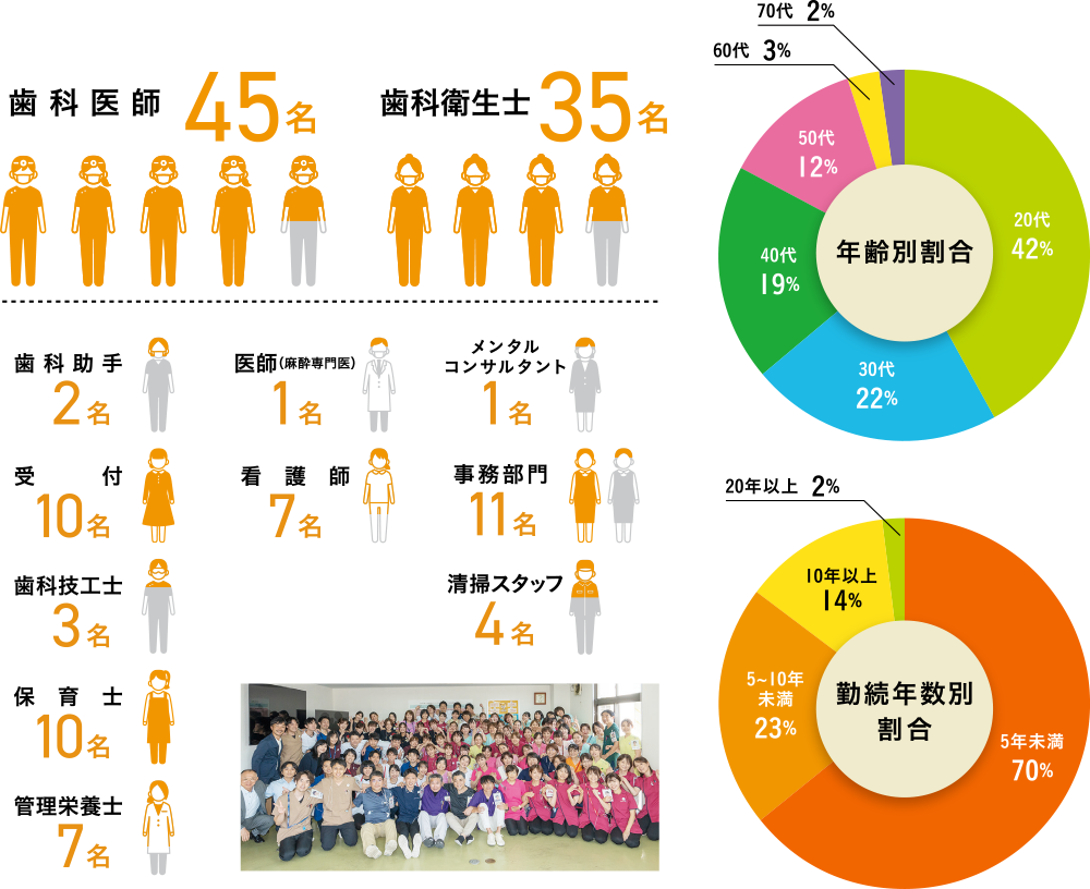 ひまわり歯科は、患者さんに信頼される歯科医療を提供し続け、多くのスタッフとともに地域に根ざした診療を行っています。ここでは、私たちの規模や実績を「数字」でご紹介いたします。運営母体としての安定性や、歯科衛生士として働く環境の充実度も、ぜひご覧ください。